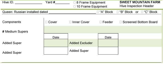 Here is an example of a SMF Inspection Report. One sheet of paper is used for each hive for the entire season. The static information is at the top of the page.